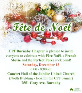 Canadian Parents for French Burnaby Chapter invites members and friends for the celebration of Noël all together with Père Noël, French movie, and the Perfect Force rock band!
